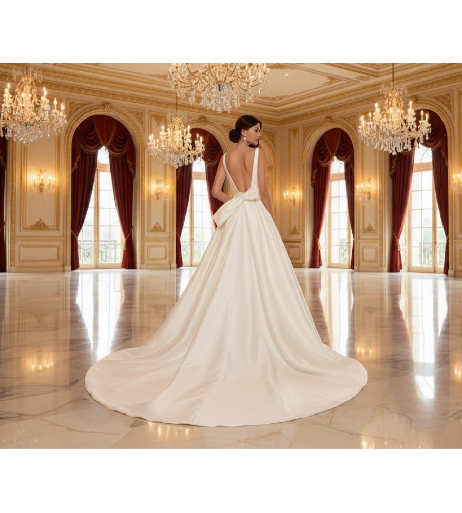 Back Detail: The dress features a dramatic, deep, scooped back for a touch of modern romance. A large, elegant couture bow is perfectly positioned at the small of the back, adding a feminine and memorable detail above the skirt.