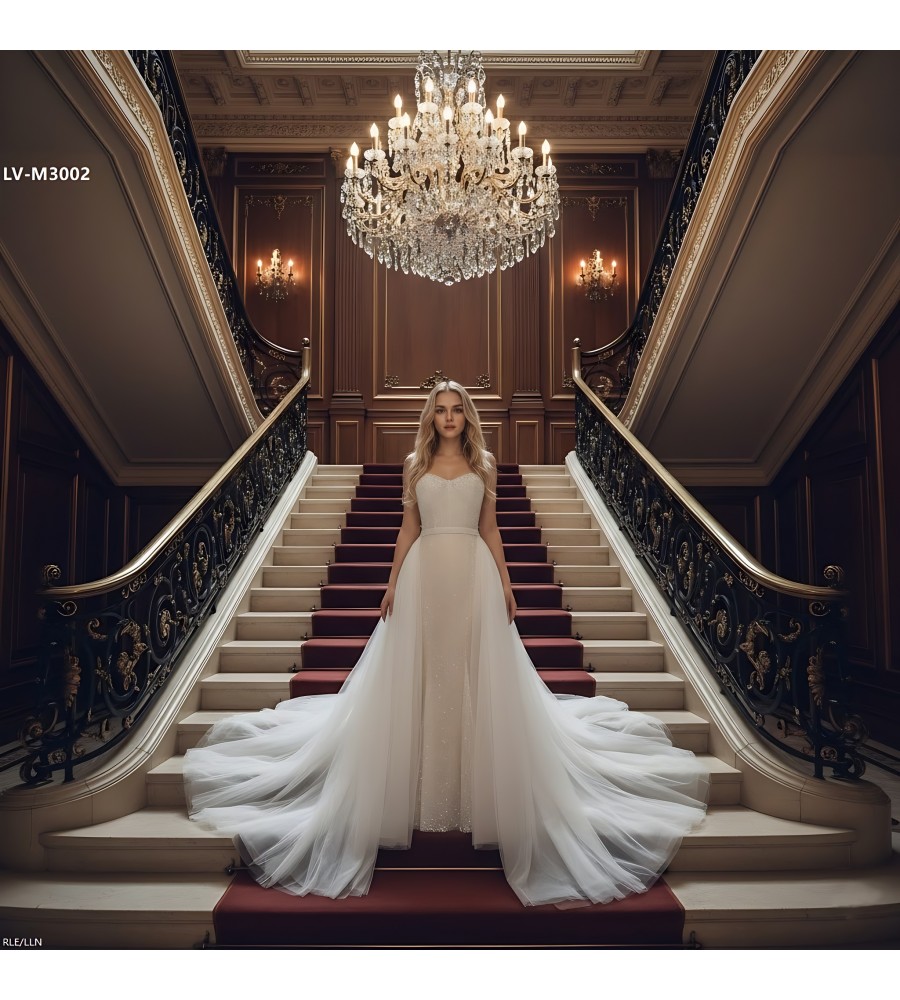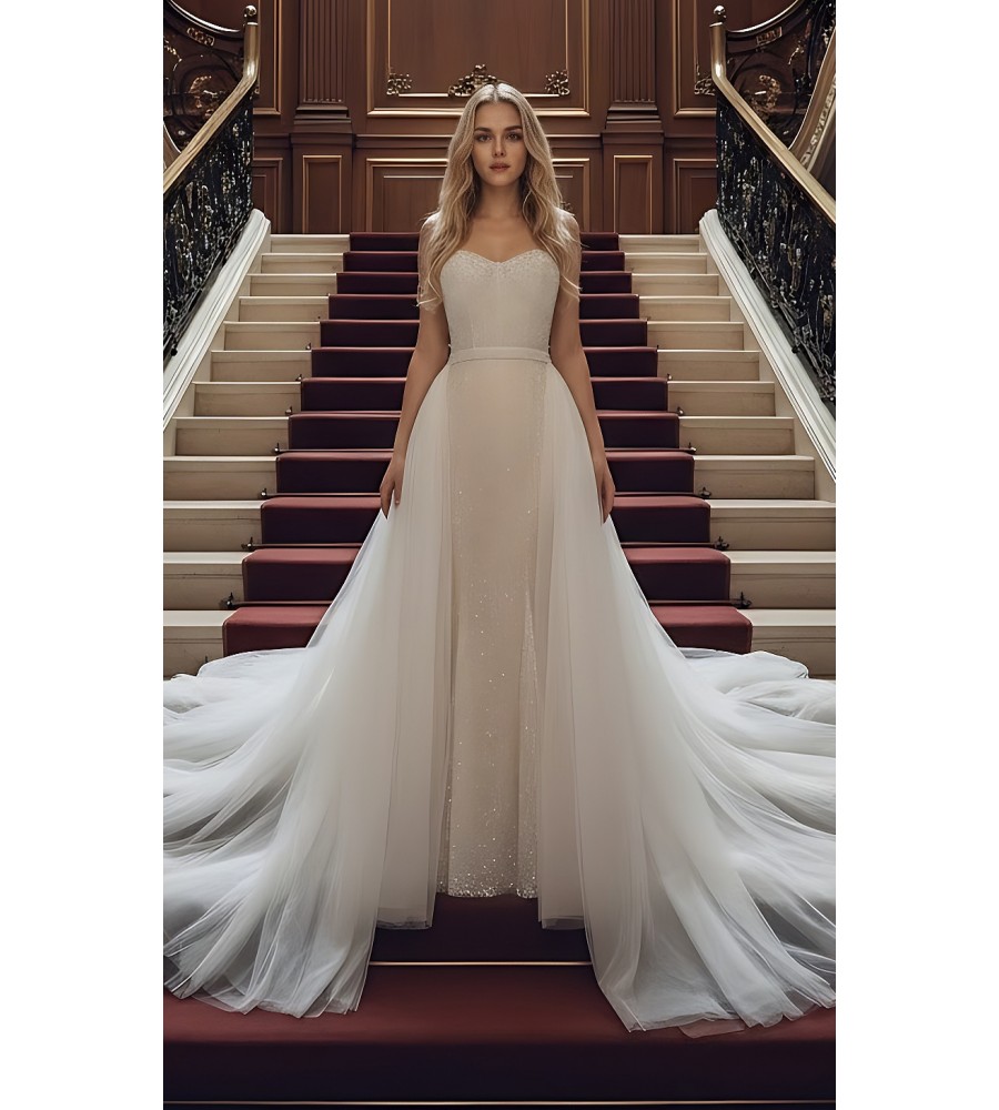 Mermaid - Heavy Beaded and Sequined Wedding Dress with Detachable Tulle Overskirt - LV-M3002OS