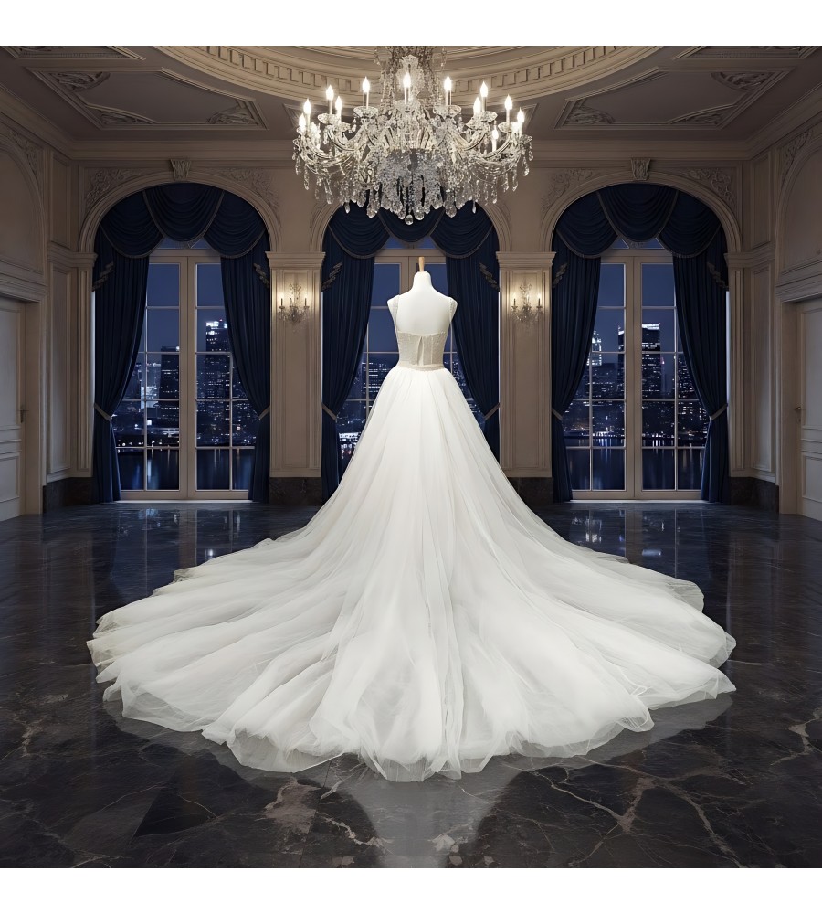 - Detachable tulle overskirt with matching beaded waistband (front closure)