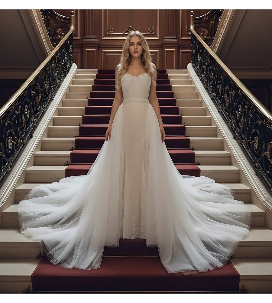 Mermaid - Heavy Beaded and Sequined Wedding Dress with Detachable Tulle Overskirt