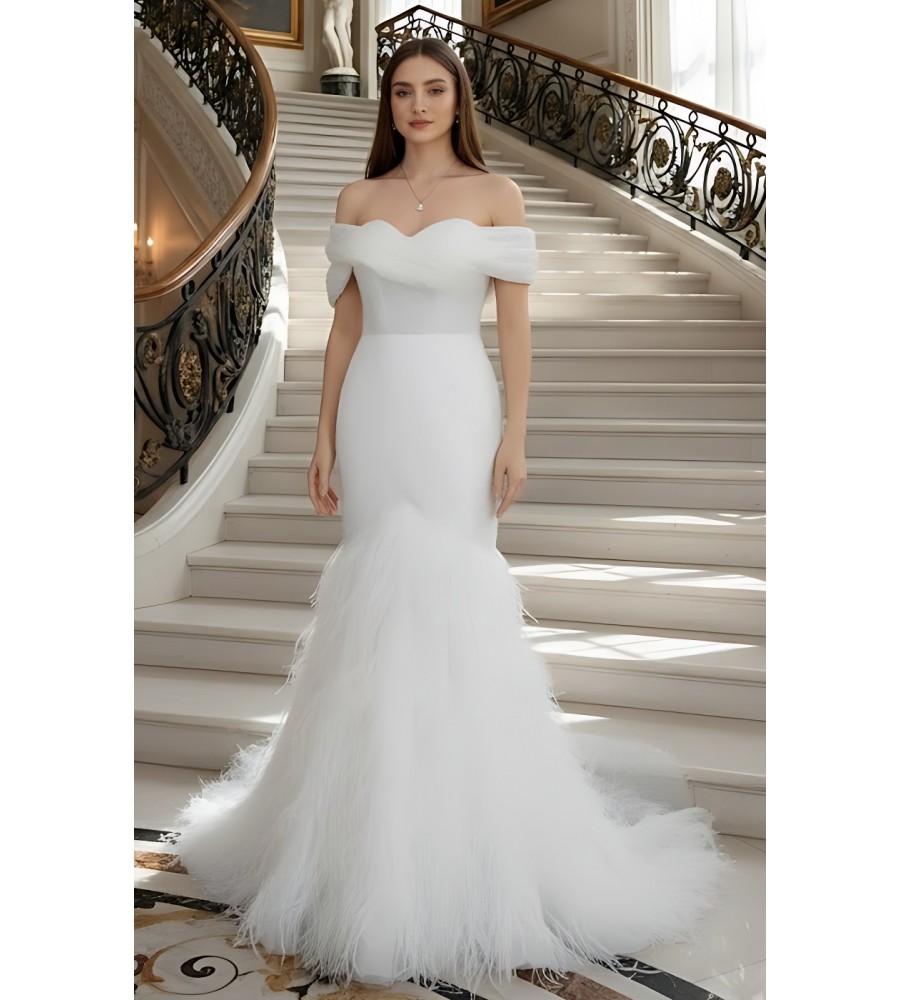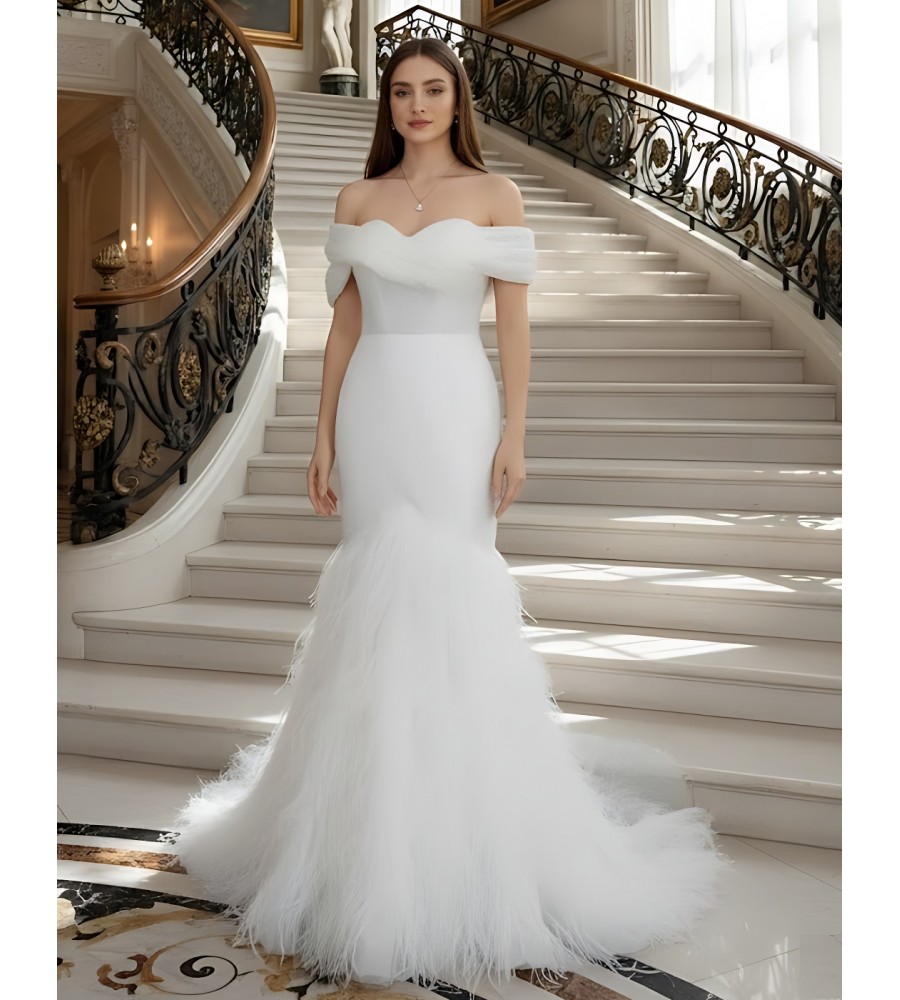 Tags: Wedding Dress, Sweetheart, Mermaid, Pleated Crossover Off-shoulder Straps, Feather skirt