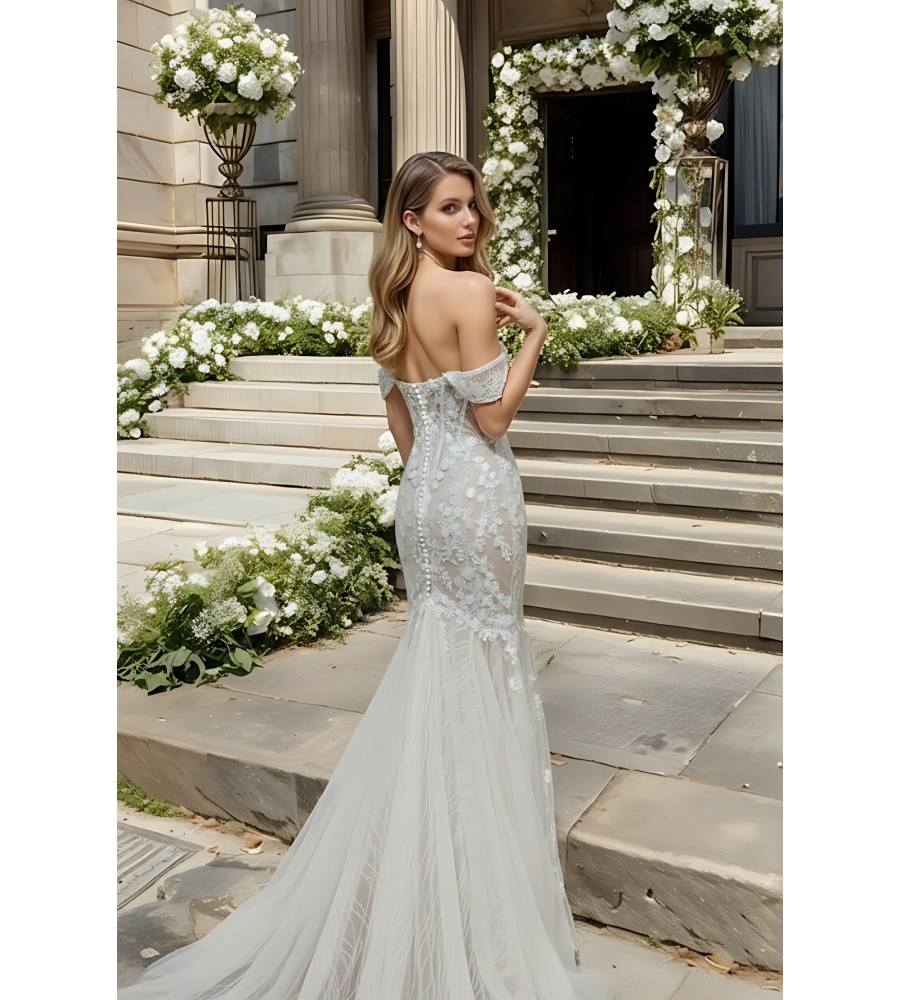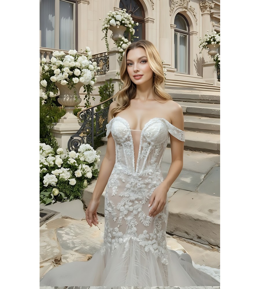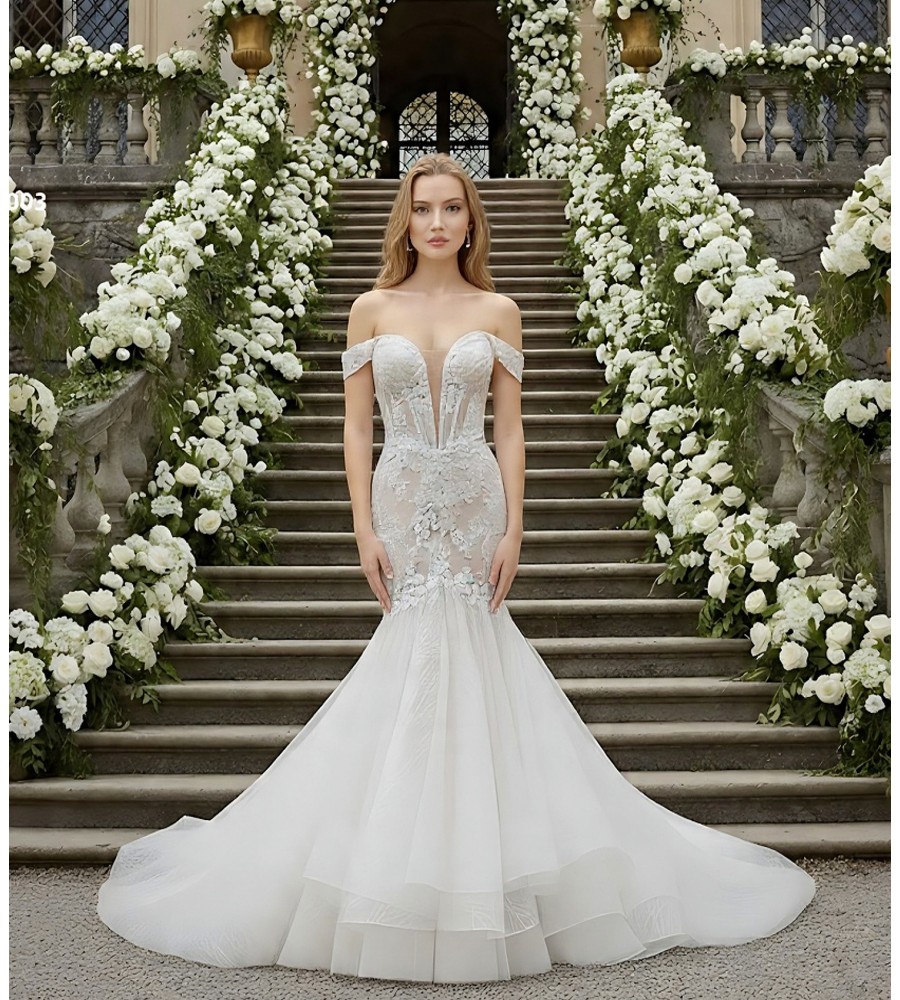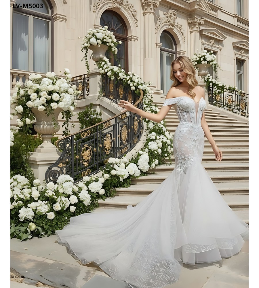 Wedding Dress - Beaded and Sequined Floral Lace Appliqued Tulle Off-Shoulder Mermaid with 3 Layered Skirt and Train - LV-M5003