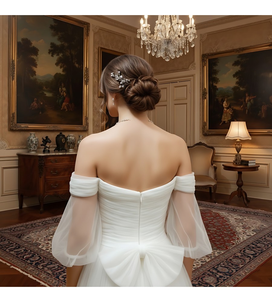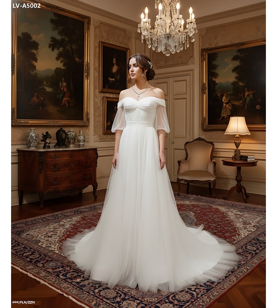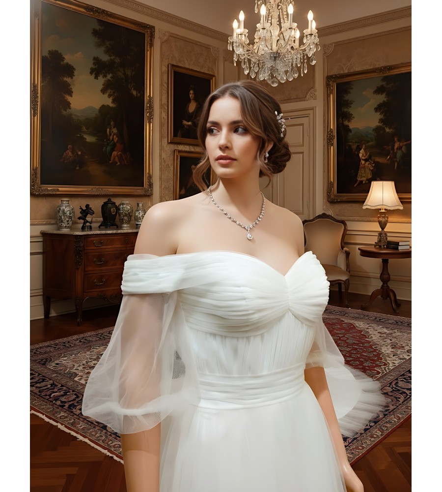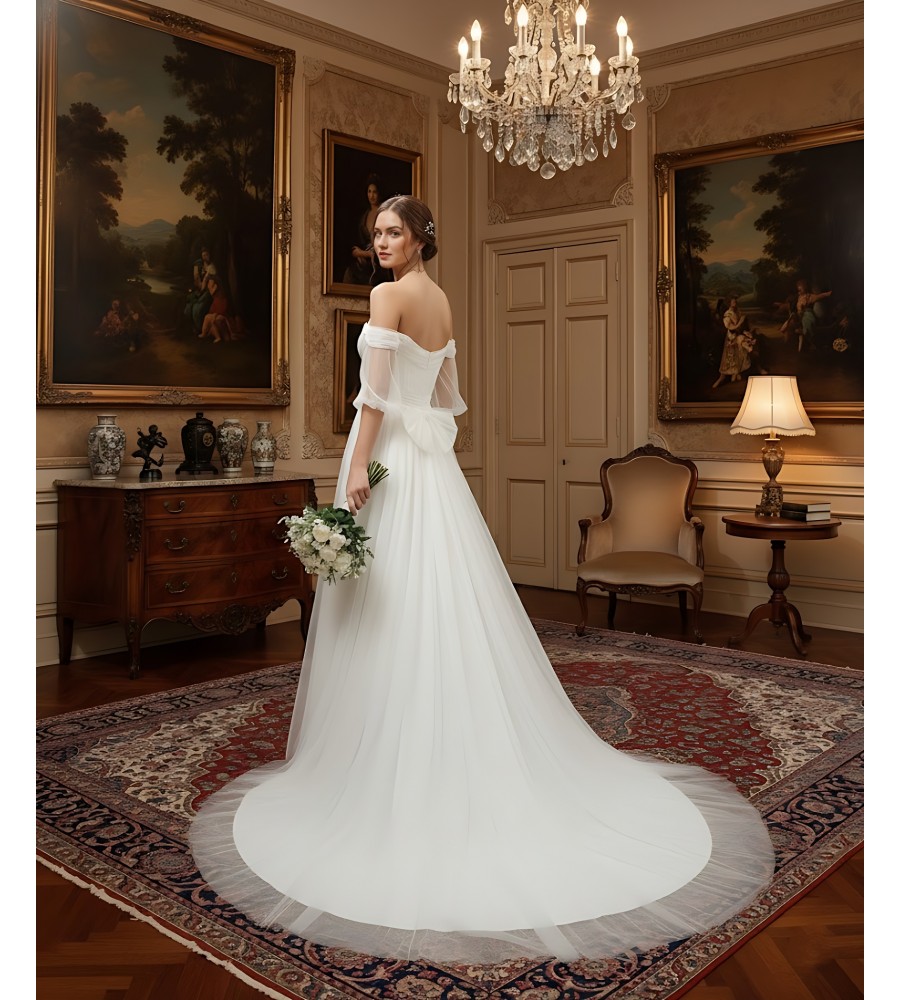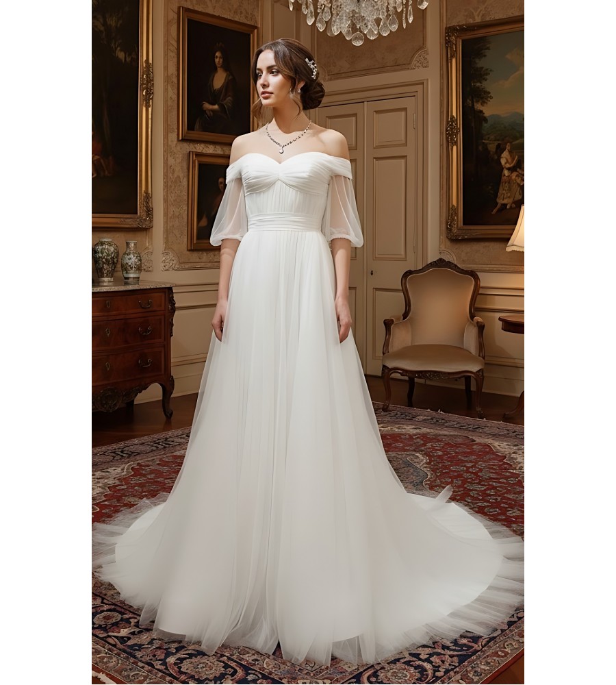 A-Line Pleated Tulle Wedding Dress with Off-Shoulder Short Sleeves- MO-A5002