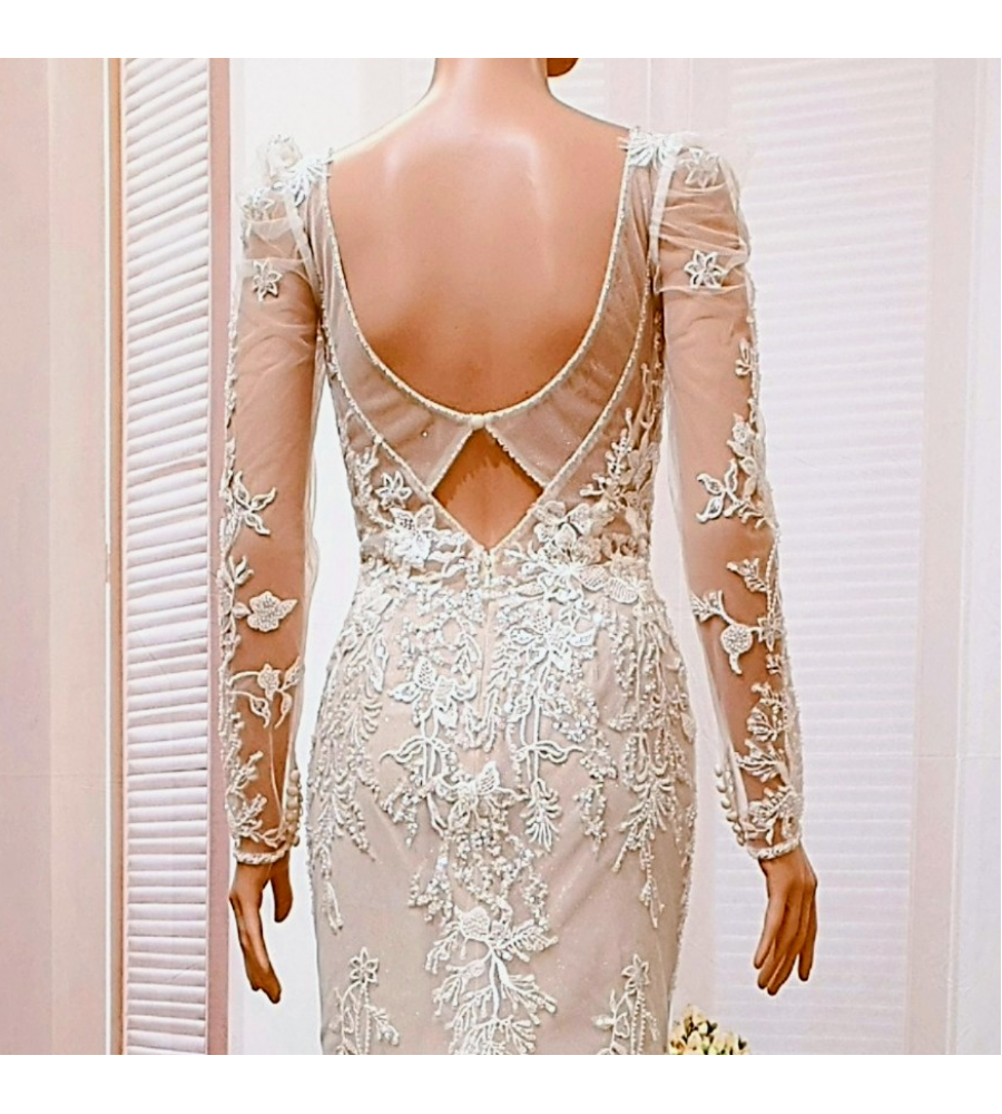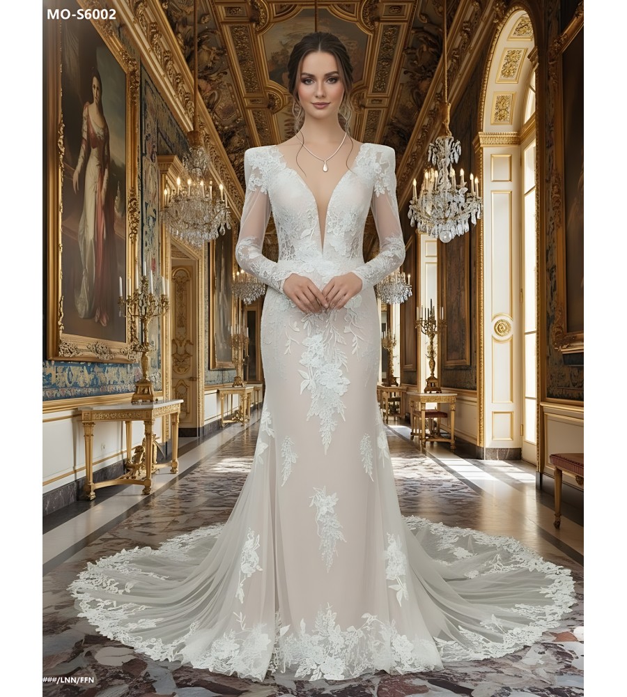 Sheath Sequined Floral Lace Cut-Out Bodice with Sheer Leg-of-Mutton Long Sleeves Wedding Dress - MO-S6002