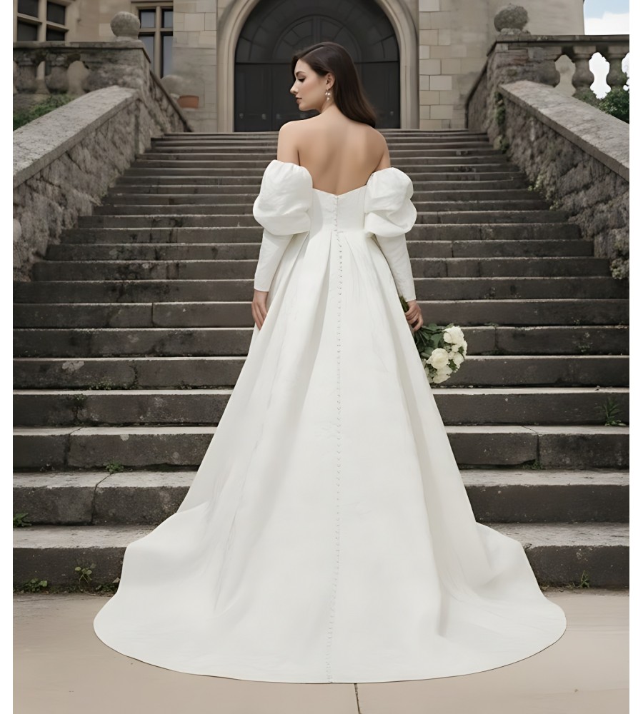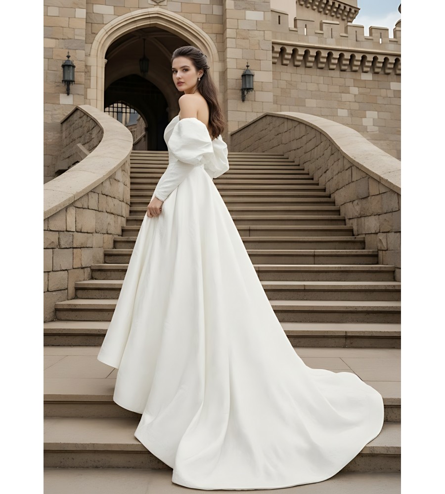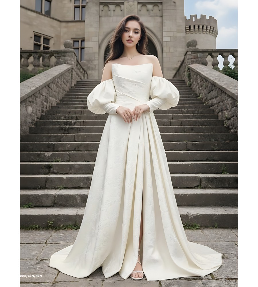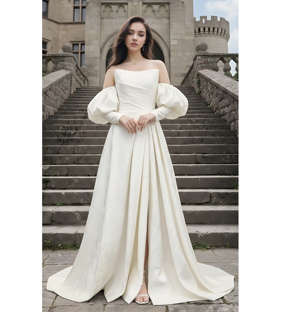 A-Line Embossed Satin Slit Skirt Wedding Dress with Detachable Balloon Long Sleeves- OU-A1005