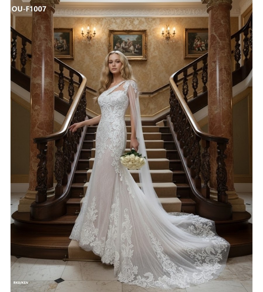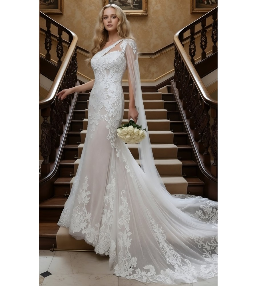 A luxurious one-shoulder mermaid wedding dress open back with a detachable shoulder cape - OU-F1007