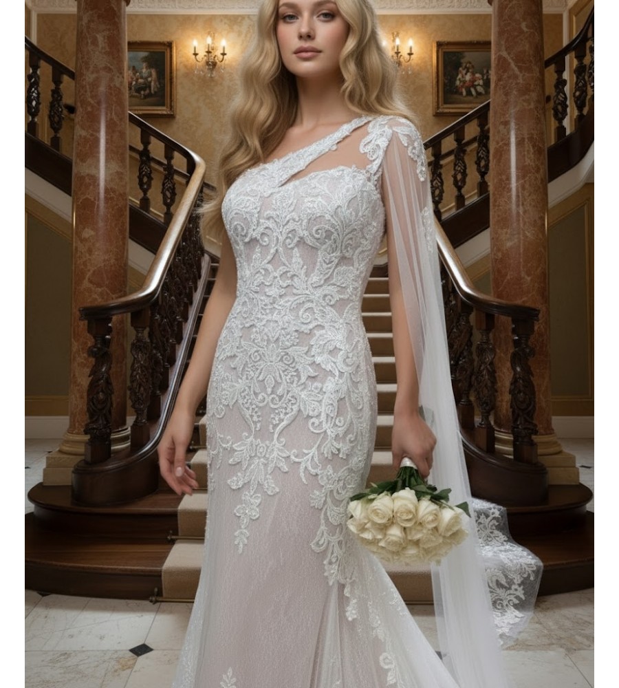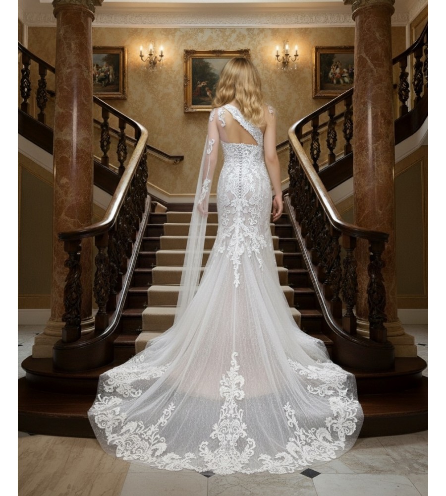 A luxurious one-shoulder mermaid wedding dress with intricate hand-beaded floral lace, a detachable shoulder cape, and a dramatic open back, exuding timeless elegance- OU-F1007