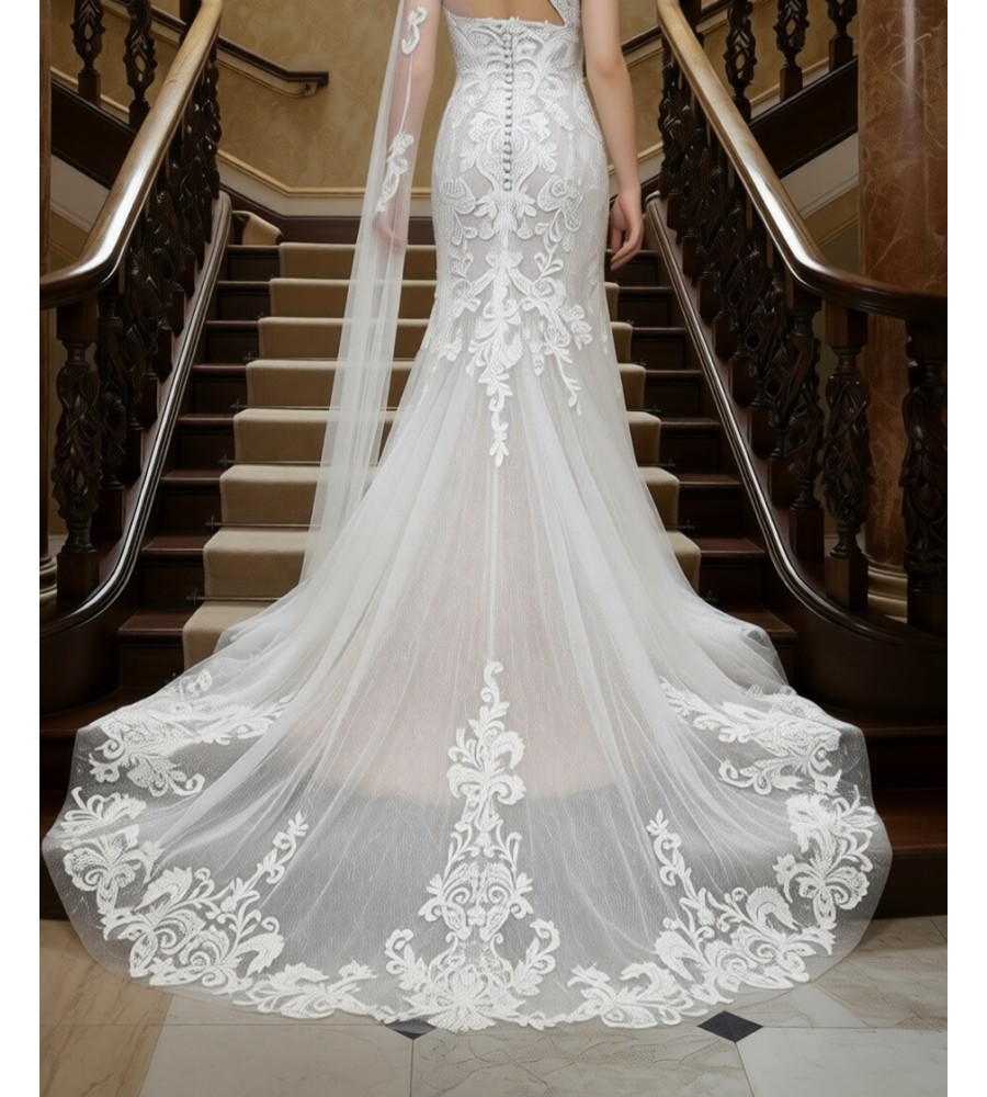 • Flowing Train with Lace Appliques: A stunning long train adorned with floral lace, perfect for dramatic entrances.