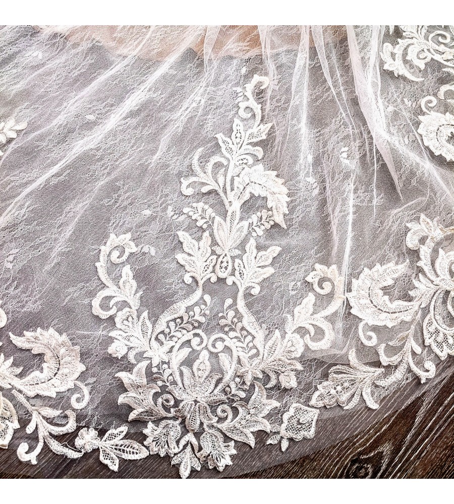 • Exquisite Lace Details: Features intricate, sheer floral lace patterns with symmetrical embroidery, highlighting exceptional craftsmanship.