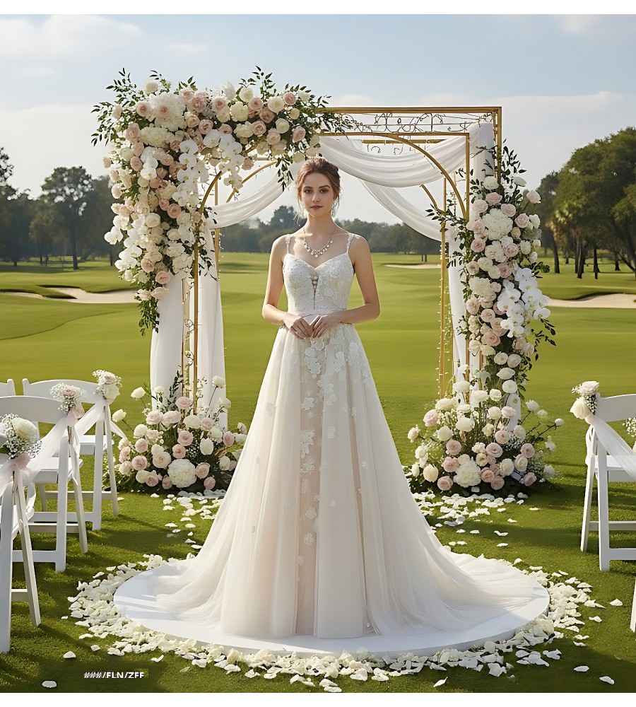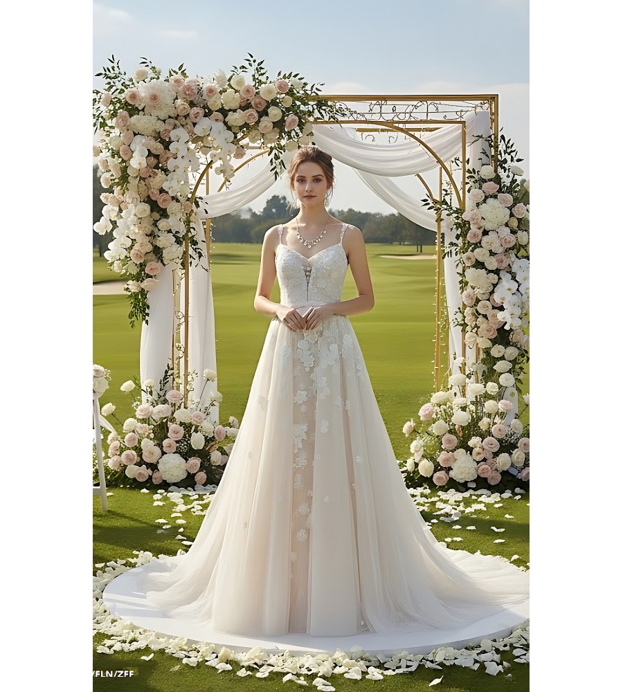 Tulle Floral Lace Appliqued Flare Wedding Dress with Overskirt -