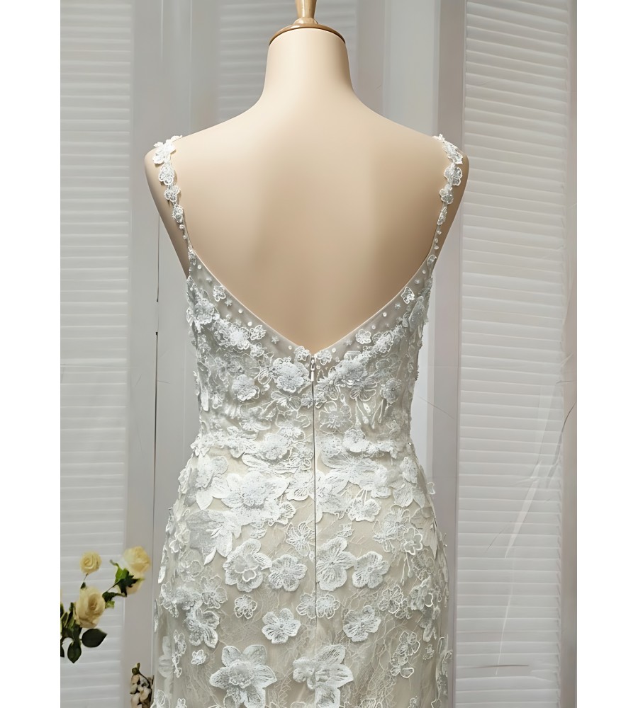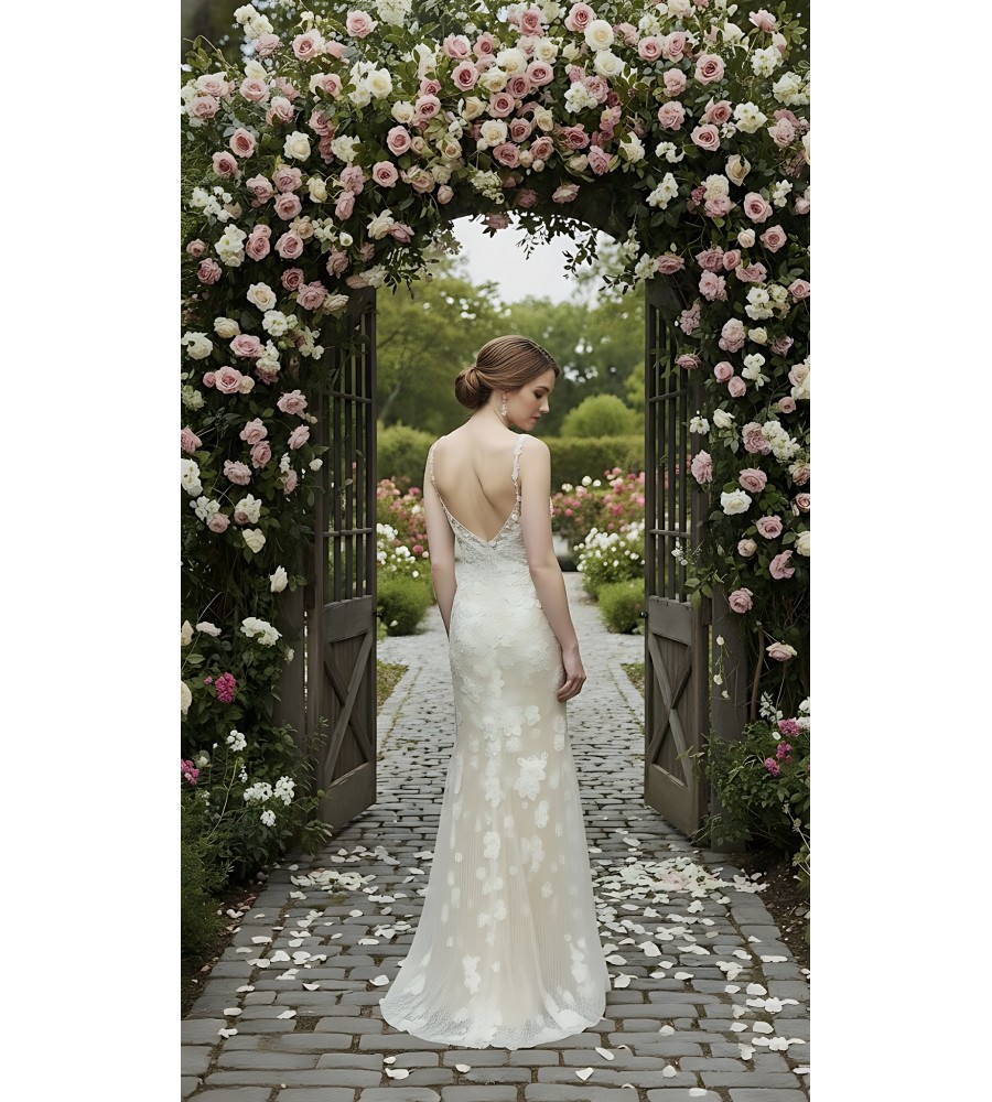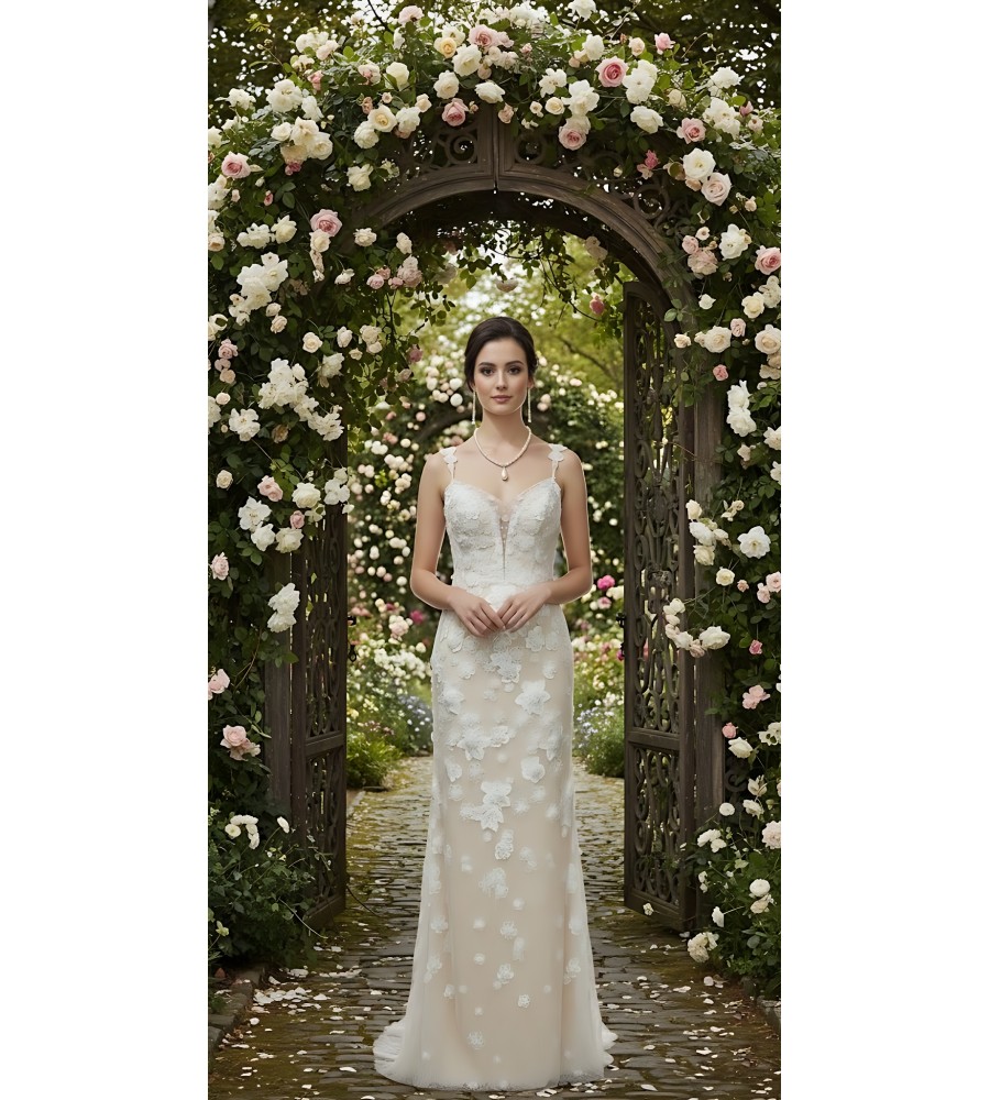 Fitted and Flare - Floral Lace Appliqued Tulle Wedding Dress with Overskirt - MO-F2006