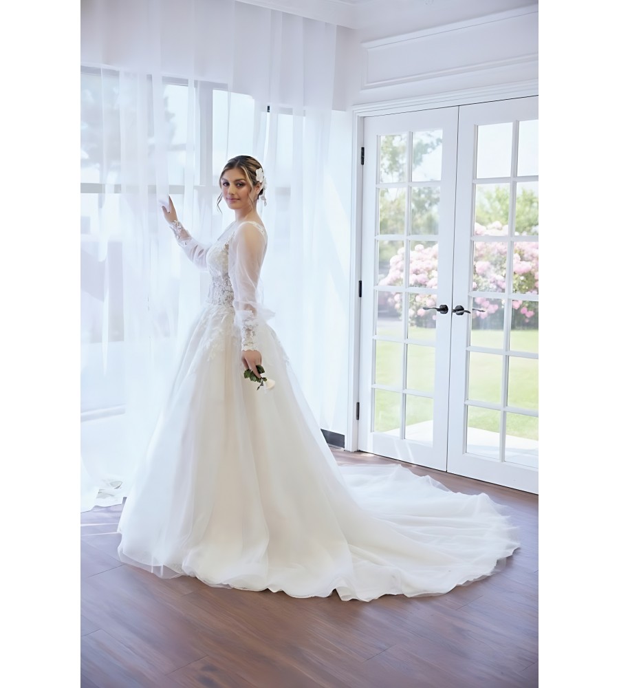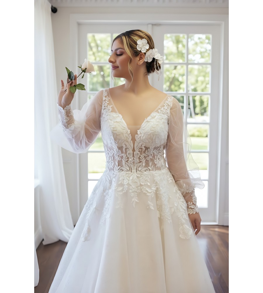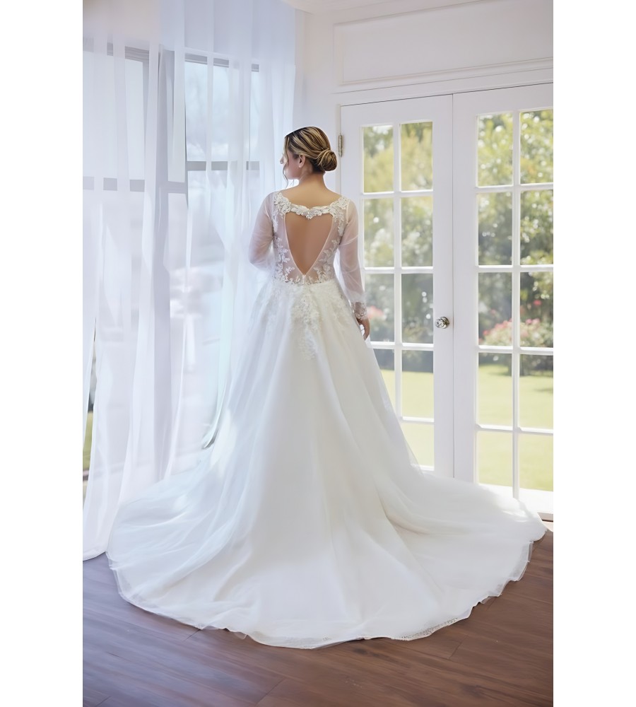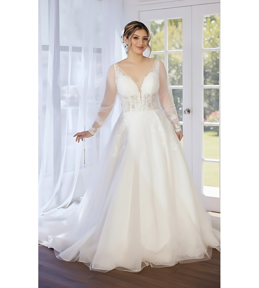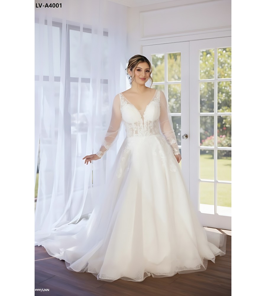 A-line Plunge V Sequined Floral Lace Tulle with Detachable Bishop Long Sleeves Wedding Dress - LV-A4001